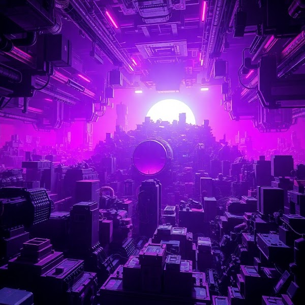 Deep ultraviolet hues and epic lens glow illuminate a massive, modern, futuristic cluttered scene, heroic elements, vivid purples and high contrast.jpg