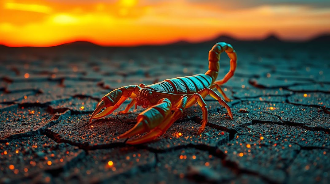 Sculptural clay art depicting a photorealistic desert scorpion crawling across cracked earth at sunset, glowing sand particles visible, macro lens perspective, ultra-high detail, vibrant complementary colors, modeled shapes, textured surfac.jpg