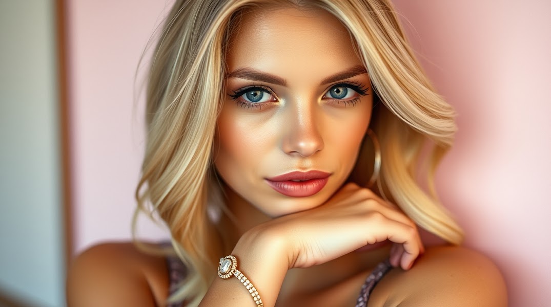 Fine art photograph a blonde woman with soft skin and subtle makeup, wearing a beautiful bracelet, bathed in soft light, pastel color palette, warm undertones, professional editorial photography style, soft contrast, and gentle saturation.jpg