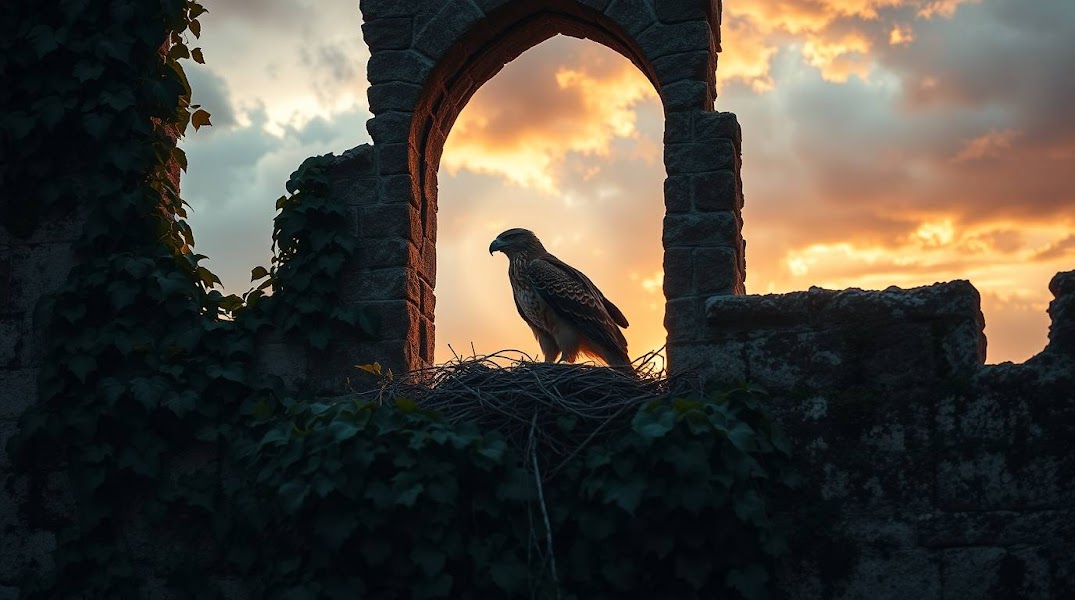 Photographic art portraying a hawk's nest in a ruined castle window. Ivy, stormy skies, and golden hour lighting with ultraviolet undertones create a mystical mood. High contrast, soft light, and a light aura around the hawk. Soft saturati.jpg