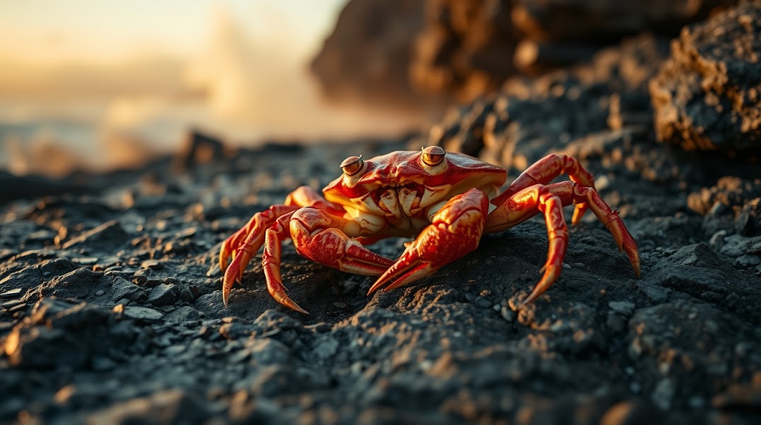 A professional, fine art photograph depicting a large king crab on a rocky shore during the golden hour. Soft, warm light, subtle shadows, ocean spray visible in the background. Editorial style photography.jpg