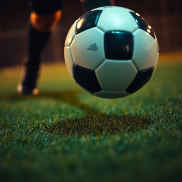A close-up professional photograph of a soccer ball being kicked on a grassy field, warm tones with soft lighting, slight darkness, soft contrast and saturation, fine art style, editorial photography aesthetic reminiscent of Associated (2).jpg
