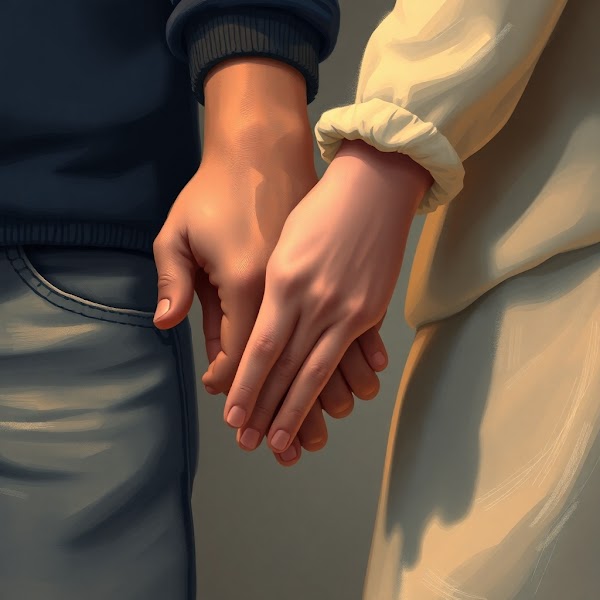A digital painting of a young couple holding hands, their hands intertwined, detailed skin textures, warm lighting, romantic atmosphere, soft focus, close-up framing.jpg