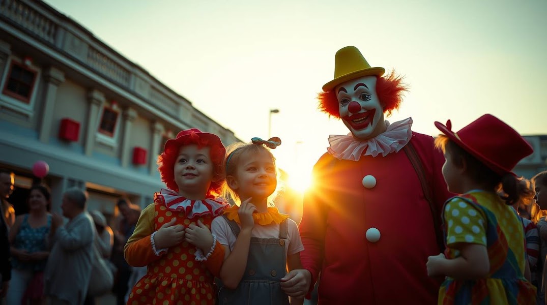 A dramatic, cinematic candid street photograph of a children's clown show in a golden hour light clowns and children with vibrant complementary colors, film-like composition, soft light, contrasting colors, balanced tones, emphasizing spont.jpg