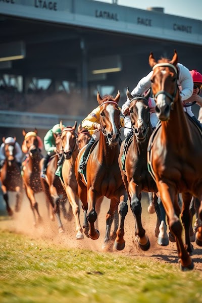 A dynamic photograph of thoroughbred horses and jockeys mid-race, featuring strong hard light, blurred lines, action poses, direct harsh shadows, and a focus on motion.jpg