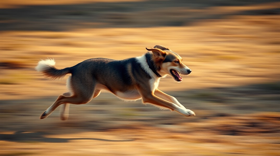 A fine art photograph of a dog running, captured in a style reminiscent of an Associated Press Photo of the Year, with warm undertones, soft shadows, soft contrast, and slightly desaturated colors.jpg