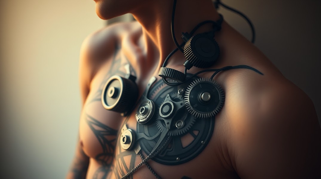 A fine art photograph, warm and slightly dark, soft lighting, soft pastel colors. The subject is a futuristic biomechanical tattoo with exposed gears, pistons, and wires blending seamlessly with human muscle and veins. Gentle and soothing, .jpg
