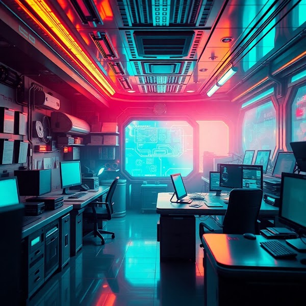 A futuristic sci-fi office filled with advanced technology and space elements, rendered in electric vivid colors. The style is soft cinematic haze with soft focus and a hazy background.jpg