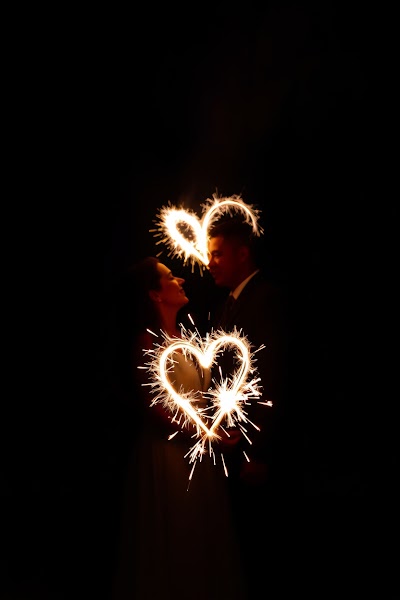 A long-exposure photograph depicting a couple, silhouetted against a dark night sky, using sparklers to create a glowing heart shape, showcasing motion blur and vibrant light trails.jpg