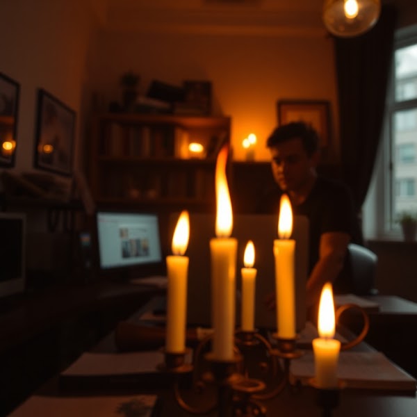 A long exposure photograph of an office illuminated by warm candlelight; flickering flames creating a warm glow, with visible motion trails.jpg