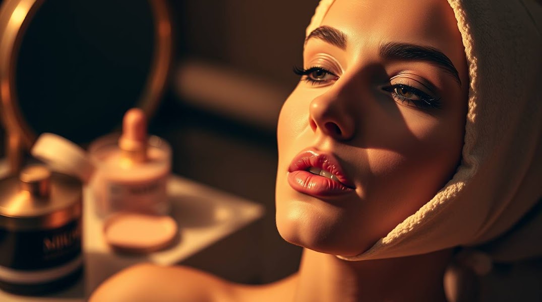 A professional editorial photograph showcasing a makeup skincare service, styled like a Photo Of The Year contender. The image is warm toned, yet slightly dark, with soft lighting and a soft, muted color palette. Emphasis on soft contrast.jpg