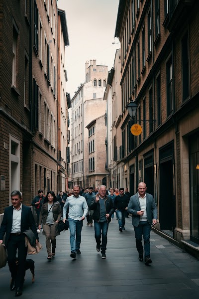 A professional fine art photograph depicting a bustling European city street, with pedestrians walking past aged brick buildings. The image employs a warm, slightly dark, and soft aesthetic, featuring subtle contrast and saturation, reminis.jpg