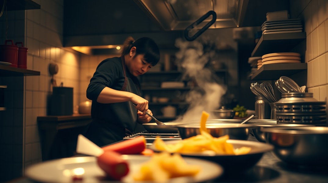 A professional, fine art photograph of a cooking scene. The style emulates Associated Press and Photo Of The Year, utilizing soft, warm lighting with subtle darkness, soft contrast, and soft saturation. An unusual perspective is desired.jpg