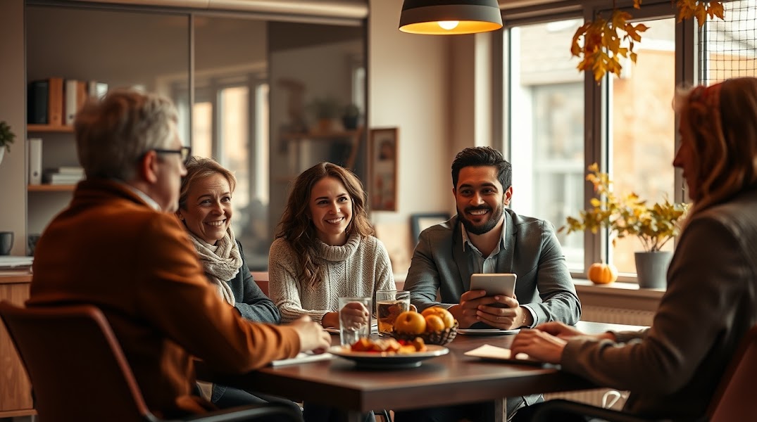 A professional photograph in the style of Associated Press, reminiscent of a Photo of the Year winner, depicting a business meeting in an office during autumn. Warm, earthy colors dominate, with soft contrast and saturation. The scene (6).jpg
