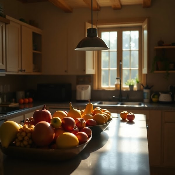A professional photograph of a sunlit kitchen featuring a variety of fruits, exhibiting warm, slightly dark tones, soft contrast, and soft saturation, in the style of Associated Press editorial photography, aiming for a Photo of the Year qu.jpg