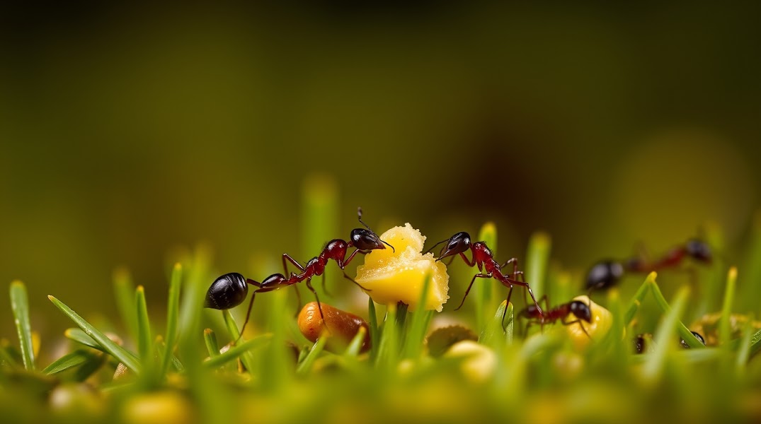 A professional photograph, warm and slightly dark tones, soft focus, depicting ants elegantly carrying food across green grass. Refined details, soft contrast and saturation, emulating the style of an Associated Press Photo of the Year.jpg