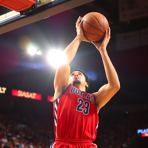 A professional photograph, warm yet slightly dark, depicting a basketball player intensely focused while blocking a shot. Bright lens flare, light streaks, vibrant colors, soft contrast and saturation. Associated Press style editorial pho.jpg
