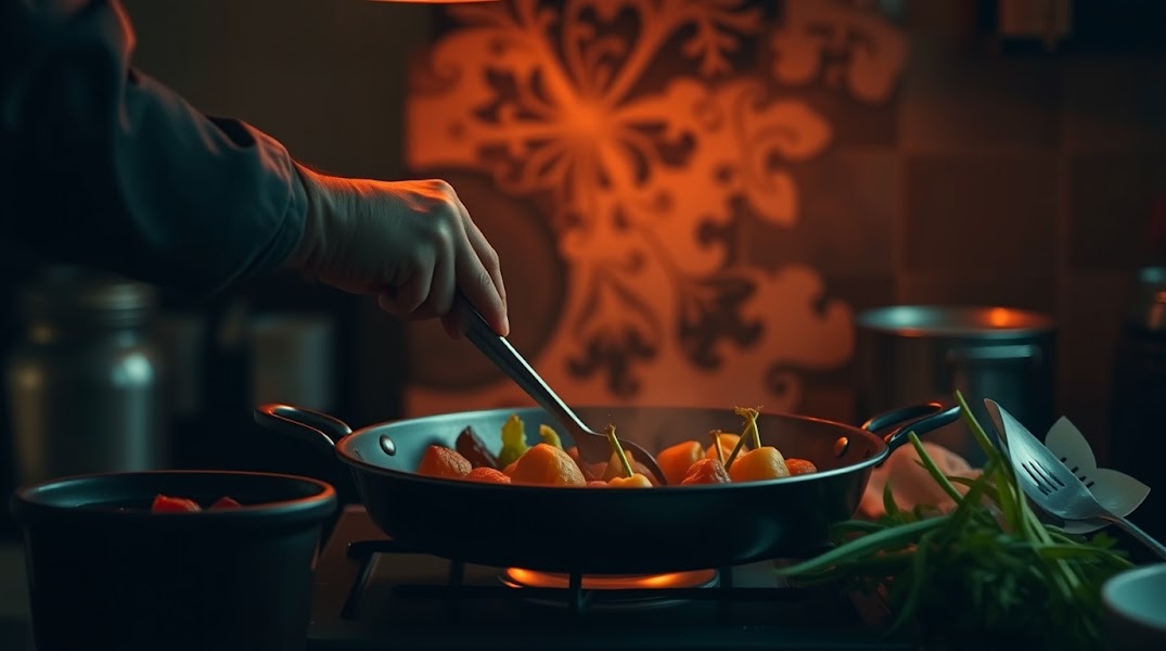 A professional, softly lit photograph of cooking, with a subtle dark and warm tone. The unusual composition and soft contrast and saturation create a unique fine art feel.jpg