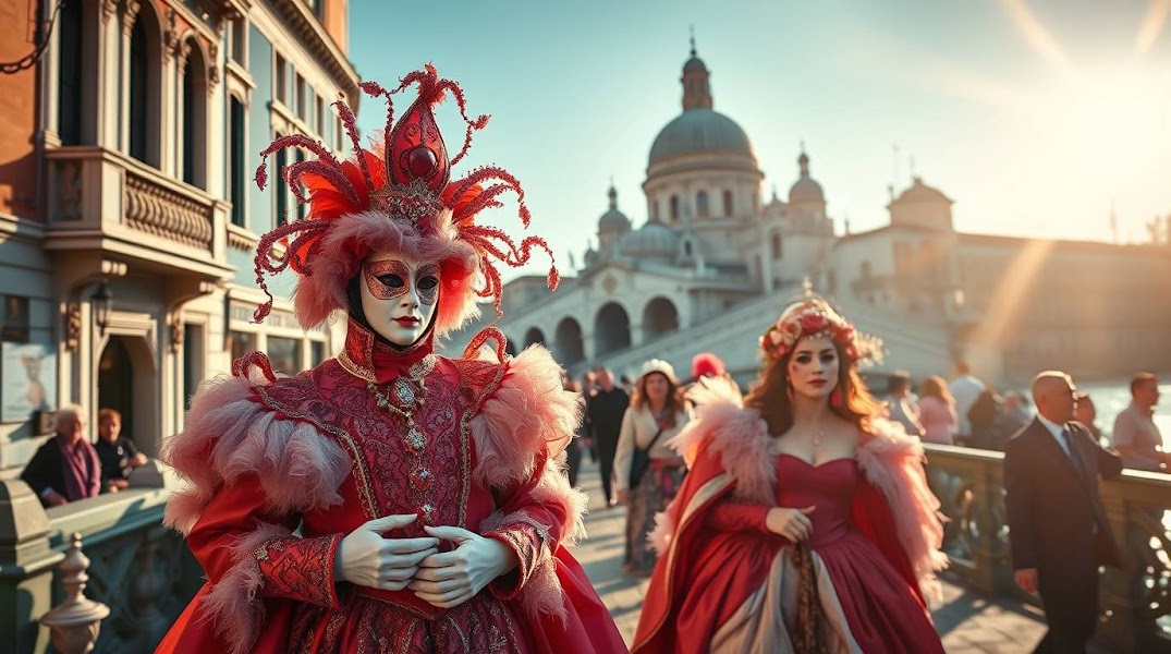 A realistic candid street photograph of a sunlit Venetian Carnevale. Lavish baroque costumes, masked revelers strolling by canals and bridges. Ancient architecture in background, emphasis on spontaneous candid moments. Vibrant color palet.jpg