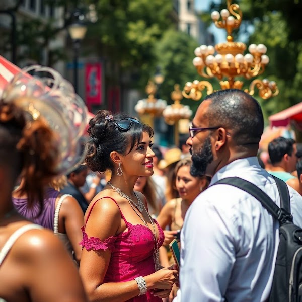 A realistic candid street photograph of an elegant urban carnival at daylight. Focus on spontaneous candid moments, capturing the scene's natural energy and showcasing detailed textures and vivid colors.jpg