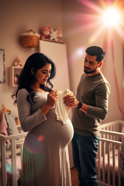 A warm and slightly dark professional fine art photograph showcasing a couple decorating a nursery in soft pastel colors. Bright lens flare adds a dreamy quality. The pregnant woman gently holds a tiny onesie. The man, with a focused expre.jpg