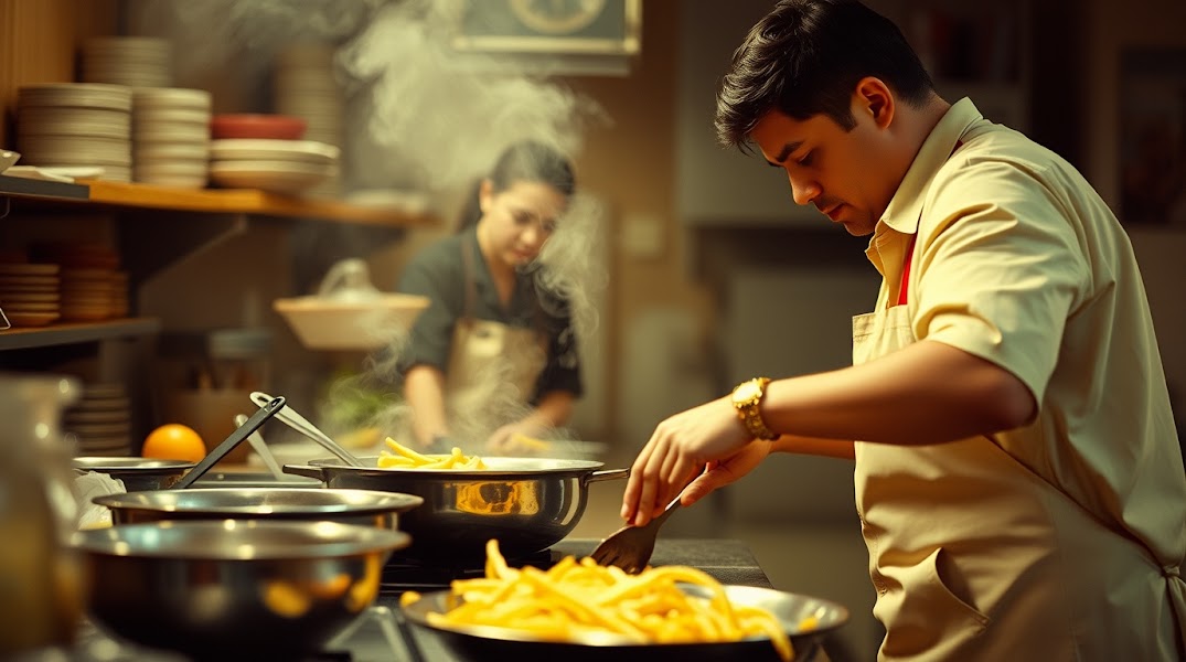 A warm-toned, professional photograph capturing a unique cooking scene. Soft lighting, soft saturation and low contrast create a fine art aesthetic, reminiscent of Associated Press photography.jpg