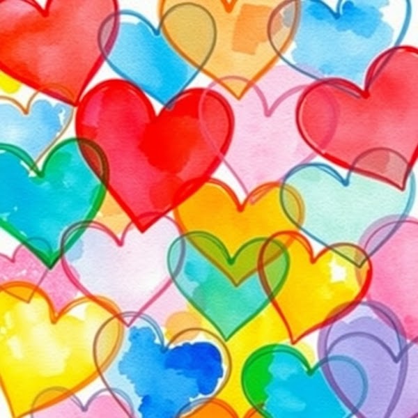 A watercolor painting of overlapping heart shapes in a range of bright, cheerful colors, exhibiting a joyful and spirited style, presented in a close-up framing.jpg