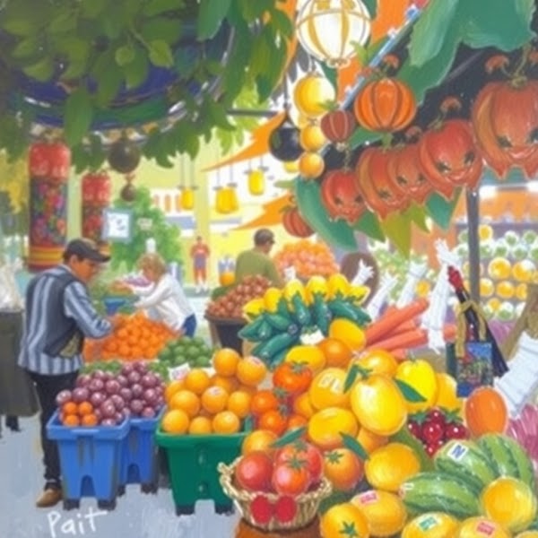 An impressionistic painting of a fruit market, blurry forms, vivid colors, loose brushstrokes, visible texture, thick paint application, plein air style.jpg