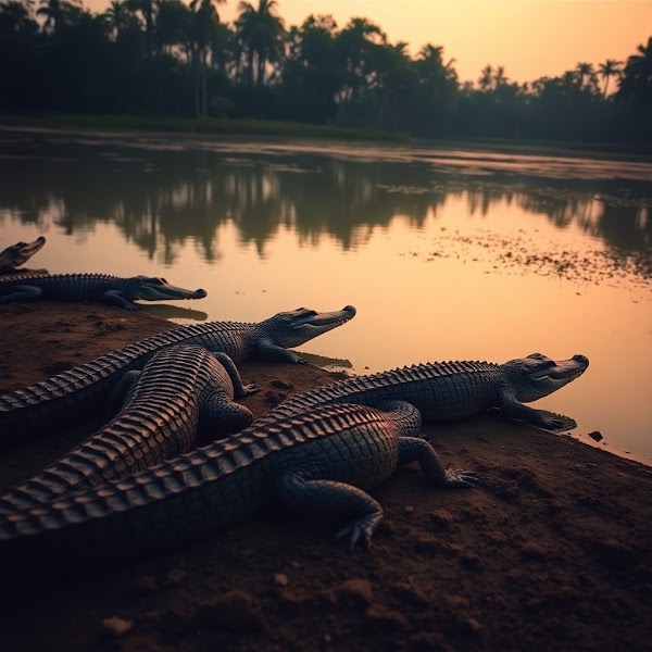 An original fine art photograph depicting crocodiles near a lake and water's edge. Warm, slightly dark, and soft lighting creates a professional editorial style with soft contrast and saturation, evoking an Associated Press or Photo Of The.jpg