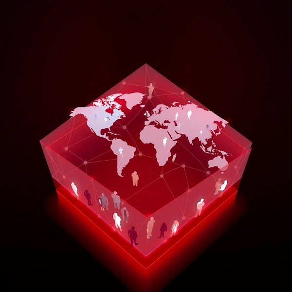 Digital artwork, abstract, high angle perspective, geometric shapes, clean lines, red color palette, soft gradients, semi-transparent world map, glowing pastel network, diverse human silhouettes, balanced composition, logo design inspiratio.jpg