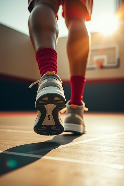 Fine art photograph, close-up of basketball shoes on a court, player about to jump, warm tones, soft lighting, vibrant colors, lens flare, photojournalistic style.jpg
