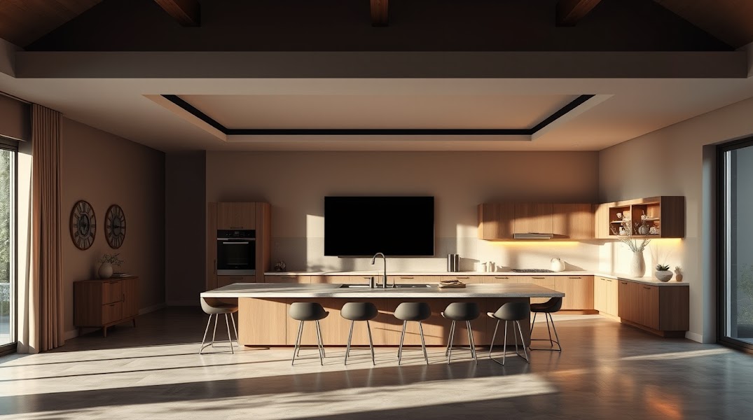 Fine art photograph, warm and slightly dark tones, soft pastel colors, gentle soft light, beautiful open kitchen with a large screen TV, diffused shadows, subtle illumination, graceful and elegant style, professional quality, soft contrast.jpg
