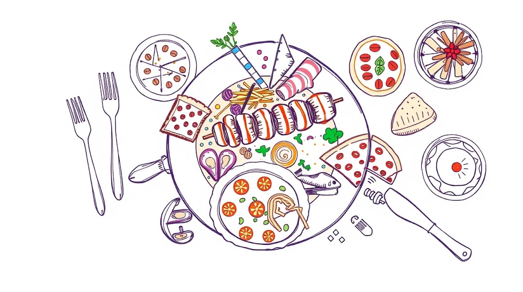 Hand-drawn sketch, overhead bird’s eye view of a plate with mixed kabab, chicken kabab, shish kabab, pizza, chicken pasta, Italian, Mediterranean, American food, french fries, burgers, chicken burger, fish, mussels, and Asian hot pot. Col.jpg
