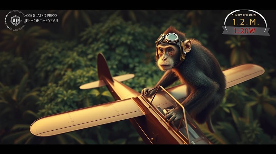 High-angle, professional photograph of a mischievous monkey with aviator goggles piloting a tiny vintage airplane above a lush jungle canopy. Warm, slightly dark tones, soft lighting, soft contrast and saturation. Editorial style, remi (6).jpg