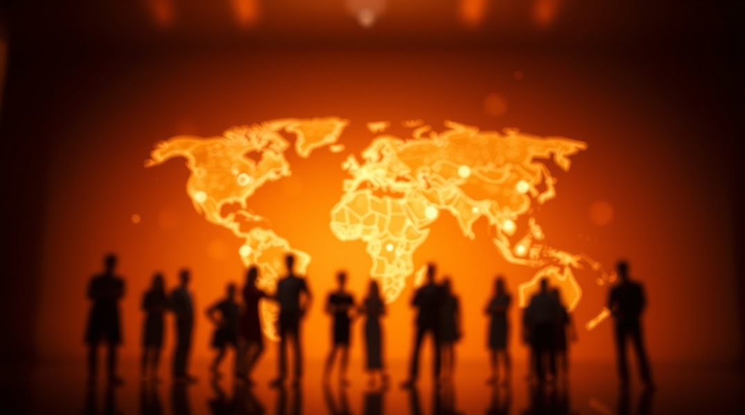 High contrast, low key lighting, blurred bokeh effect, abstract digital artwork, pastel orange palette, soft gradients, semi-transparent world map background, glowing lines and nodes, diverse people silhouettes, sharp subject focus, soft ba.jpg