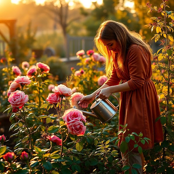 High-quality photograph, warm golden hour lighting, autumn colors, gardener in earthy tones pruning roses, watering flowers, planting herbs, soft light, serene atmosphere, lush garden, graceful and elegant composition, Associated Press styl.jpg