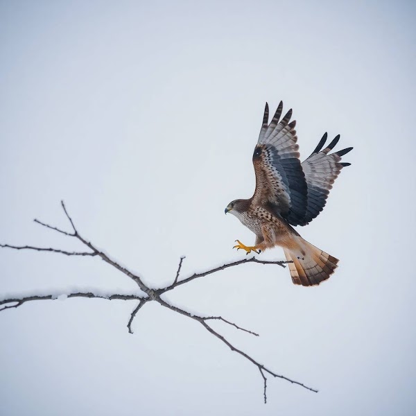 Low angle perspective of a hawk taking flight from a snowy branch, gentle soft light, diffused shadows, subtle illumination, dramatic composition, crisp winter scene, snowflakes scattering.jpg