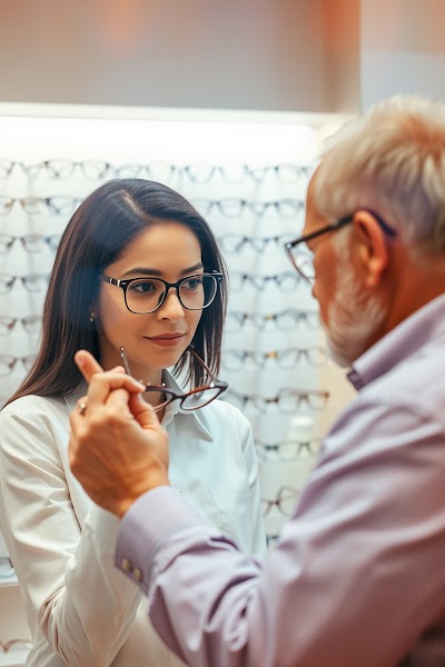 Photographic fine art, warm and soft with pastel colors and lens flare. An optometrist guides a patient selecting glasses. The patient looks into a mirror, holding various frames. Background shows shelves of attractive eyeglasses. Soothing.jpg