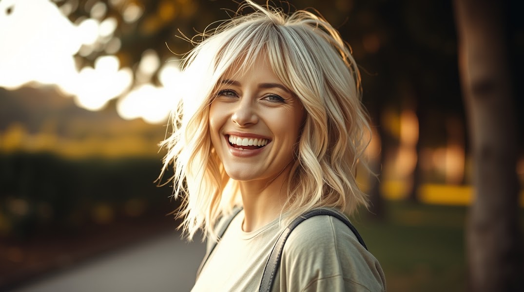 Professional fine art photograph warm and slightly dark tones soft lighting features a woman with light blonde layered shag haircut platinum highlights loose beachy waves carefree laughing expression sunlit park soft contrast soft saturatio.jpg