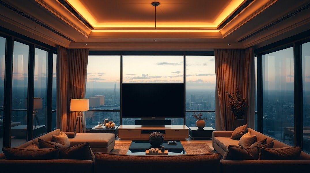 Professional fine art photograph, warm pastel tones, slightly dark, soft lighting, depicting a luxurious living room interior with a large screen TV and expansive view. Subtle illumination, diffused shadows, graceful and elegant atmosp (6).jpg