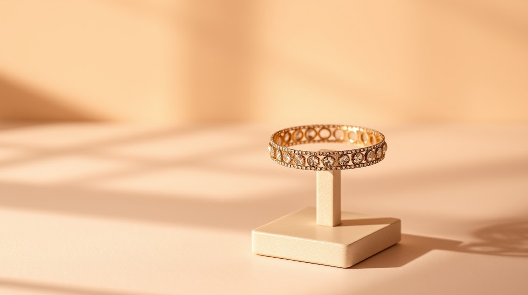 Professional fine art photograph, warm pastel tones with soft shadows, showcasing a delicate jewelry bracelet elegantly displayed on a simple stand. Soft contrast and saturation, evoking a gentle and soothing mood. Editorial photography sty.jpg