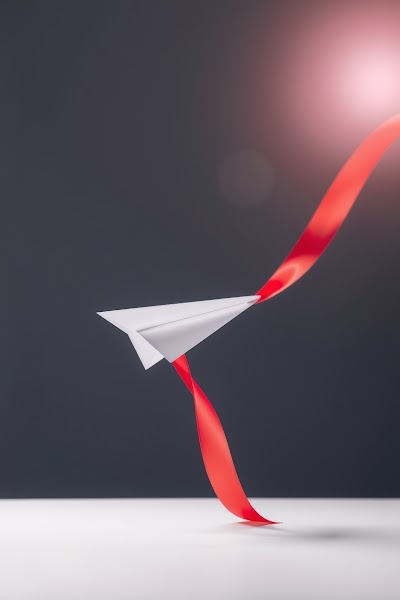 Professional, fine art photography a paper airplane ascends, a red ribbon streaming behind. The image showcases soft pastel colors, subtle dark tones, a gentle light, and a bright lens flare. The style is reminiscent of a Photo of the Year .jpg