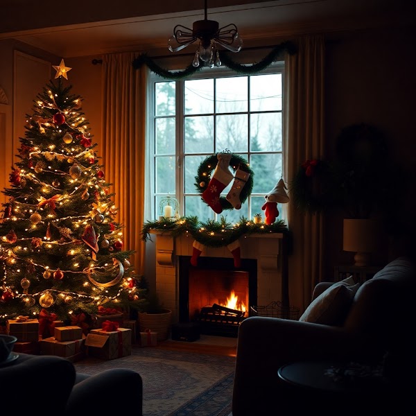 Professional, fine art photography in a warm, slightly dark, and soft style. Depicts a cozy living room with a beautifully decorated Christmas tree, twinkling lights, and stockings hanging above a warm fireplace. Soft contrast, soft saturat.jpg
