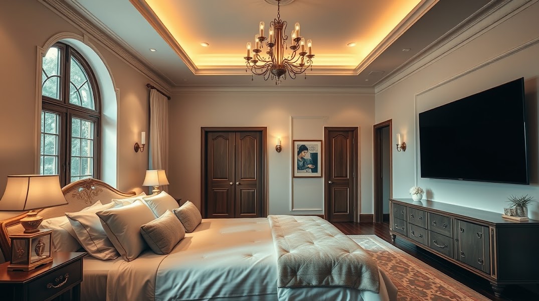 Professional, fine art photography, warm with soft dark undertones, soft pastel colors, gentle soft lighting creating diffused shadows and subtle illumination. The image depicts a graceful and elegant bedroom in a large house, with a large.jpg