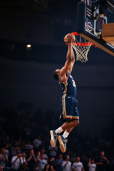 Professional photograph depicting a basketball player executing a slam dunk, the ball arcing through the hoop, a blurred cheering crowd in soft pastel colors providing a warm, slightly dark, and gentle background. Soft contrast, soft satura.jpg