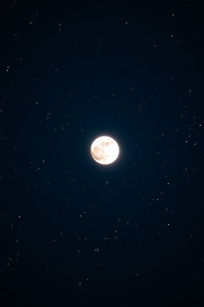 Professional photograph, fine art style, a close-up of a dark blue night sky. Numerous large stars shine brightly, and the moon is close and luminous. Warm tones, slight darkness. Soft contrast and saturation. Editorial photography.jpg
