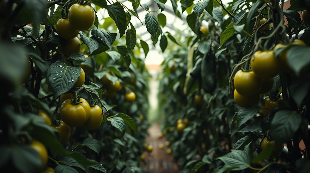 Professional photograph, fine art style. A greenhouse interior is depicted, filled with lush green tomatoes, peppers, herbs. Natural light, soft shadows, and water droplets on the leaves. Warm, slightly dark tones, soft focus. Soft contra.jpg