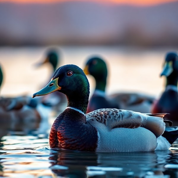 Professional photograph, fine art style, warm golden hour light, cool color tones, soft focus, ducks in their natural habitat, detailed portrayal of feathers and water, blues, greens, purples, soft contrast, soft saturation, tranquil atmosp.jpg