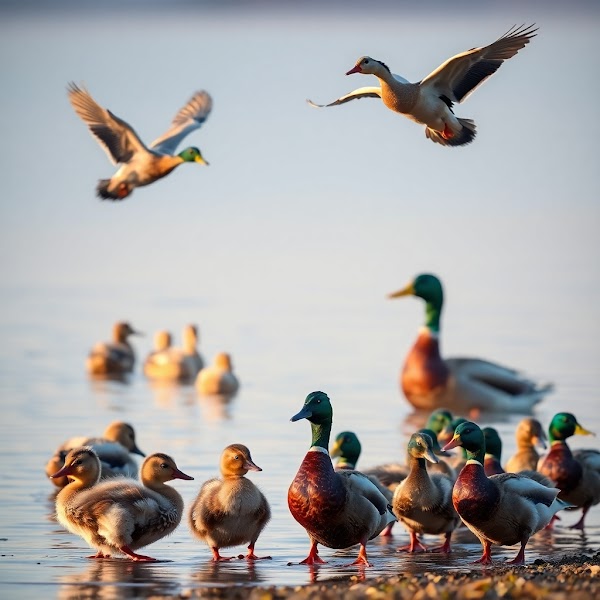 Professional photograph, fine art style, warm golden hour light with cool color tones, showcasing ducks in their natural habitat. Ducks include fluffy ducklings paddling, majestic mallards in flight, serene lakeside scenes, close-ups of fea.jpg