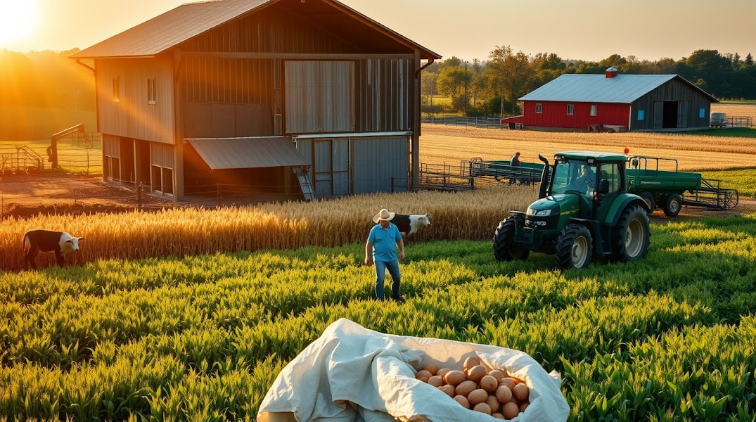 Professional photograph, fine art style, warm golden hour lighting, soft glow. Depicts farming lush green fields, farmers tending crops, rustic barns, tractors, golden wheat, and harvested produce. Soft contrast, soft saturation, radia (2).jpg